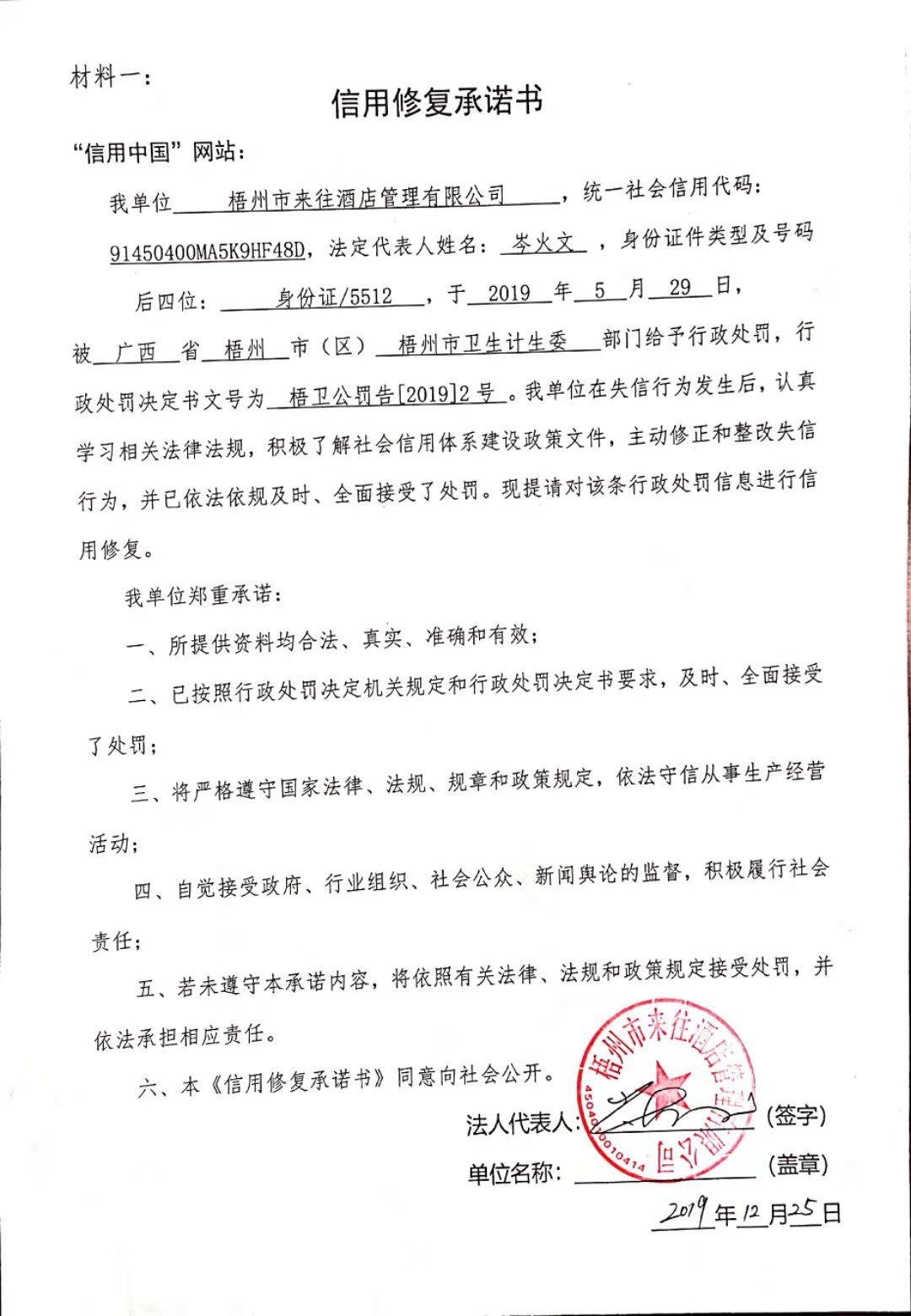 【信用修复承诺书】梧州市来往酒店管理有限公司