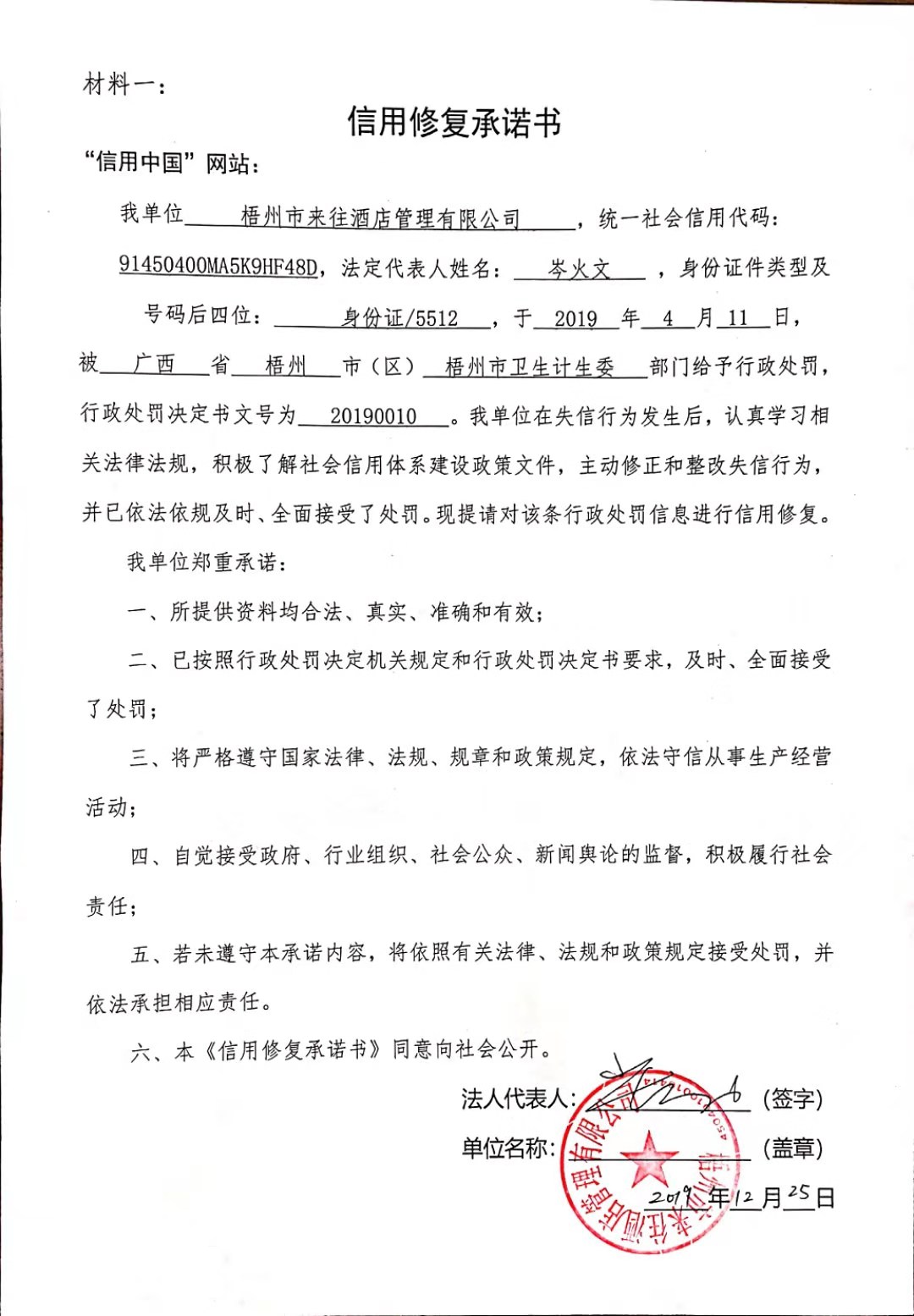 【信用修复承诺书】梧州市来往酒店管理有限公司