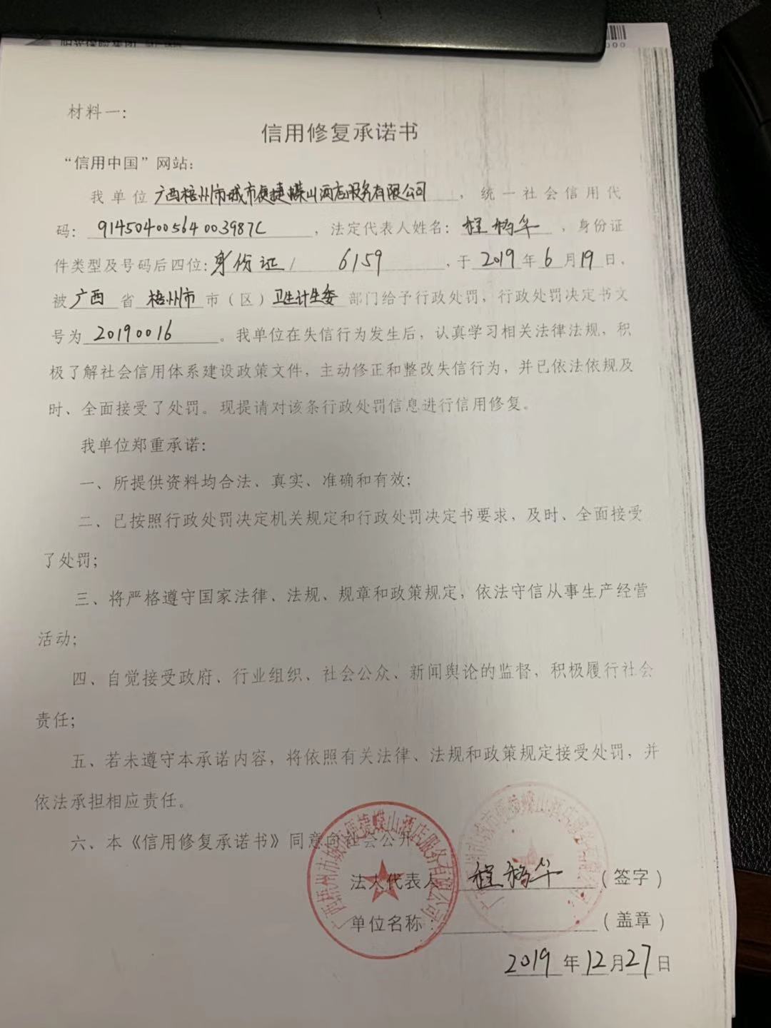 【信用修复承诺书】广西梧州市城市便捷蝶山酒店服务有限公司