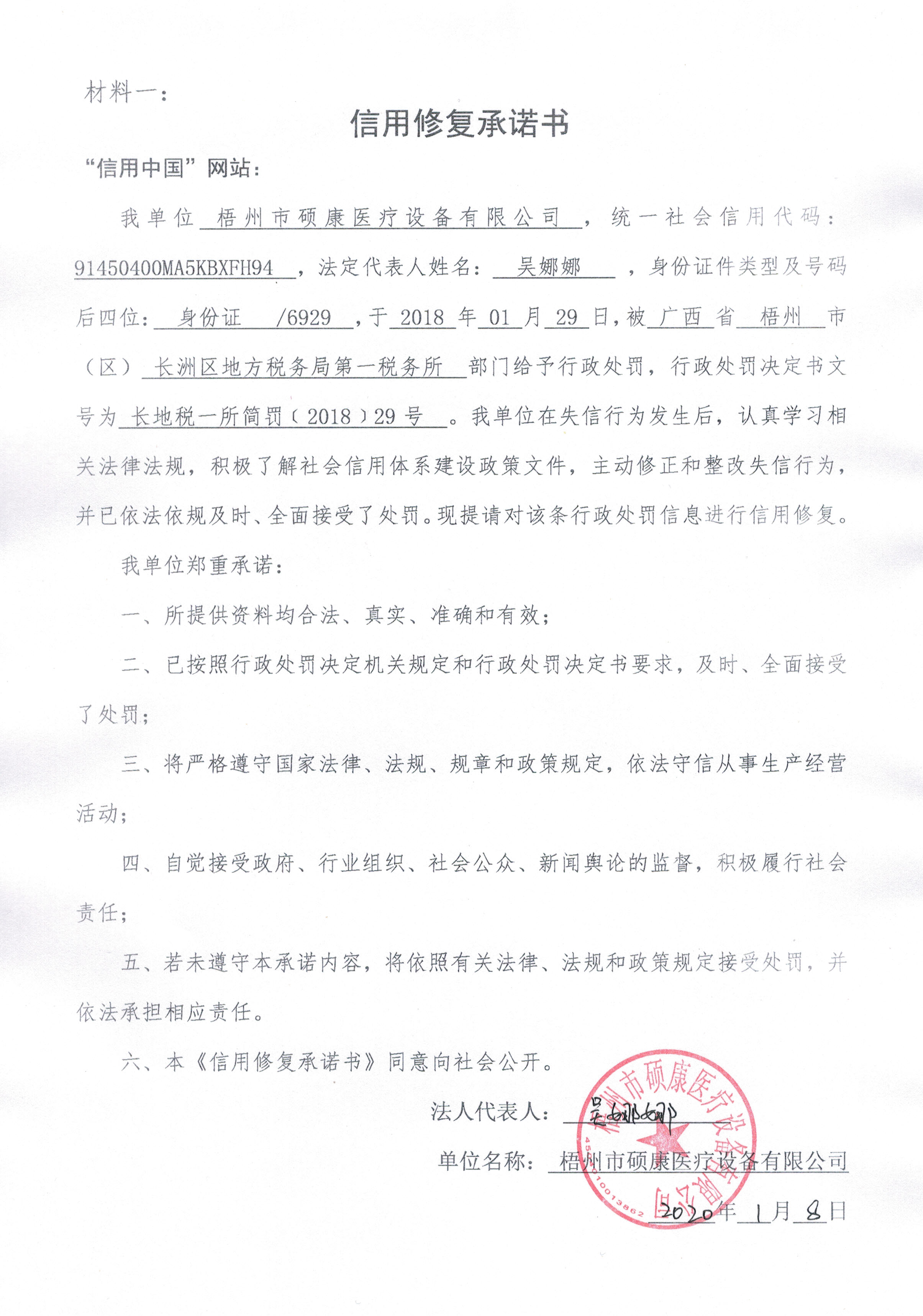 【信用修复承诺书】梧州市硕康医疗设备有限公司