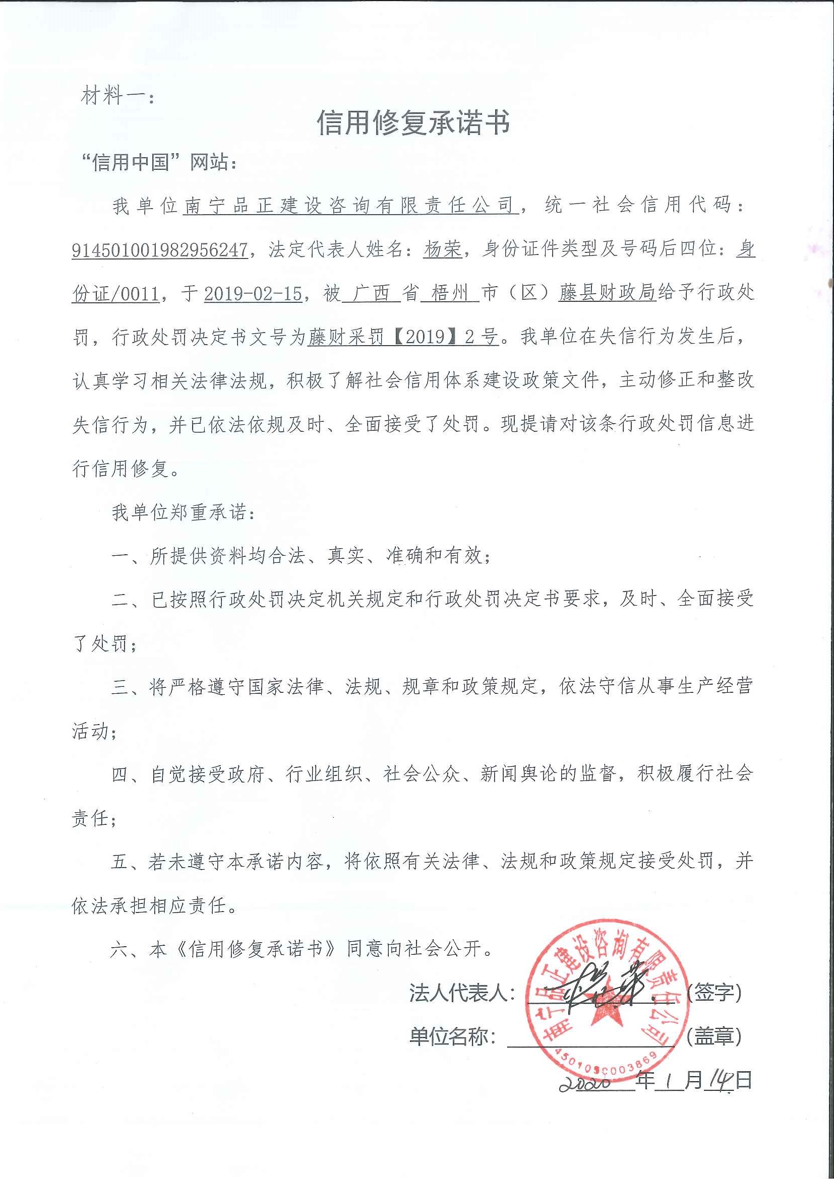 【信用修复承诺书】南宁品正建设工程咨询有限责任公司