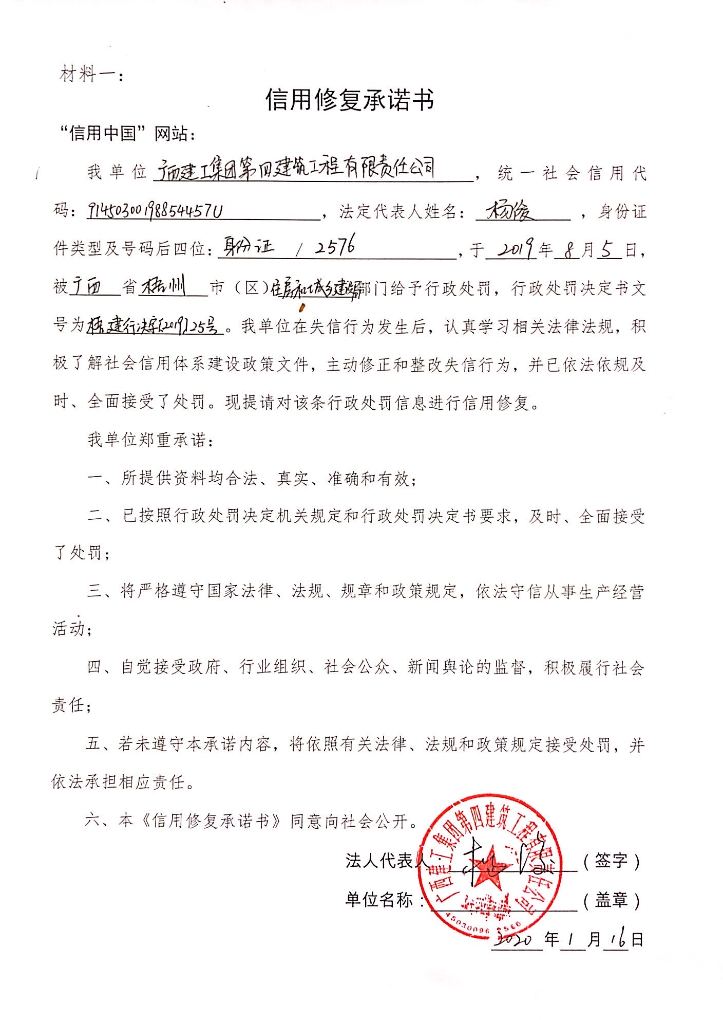 【信用修复承诺书】广西建工集团第四建筑工程有限责任公司