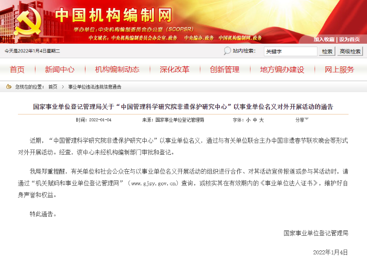 国家事业单位登记管理局关于“中国管理科学研究院非遗保护研究中心”以事业单位名义对外开展活动的通告
