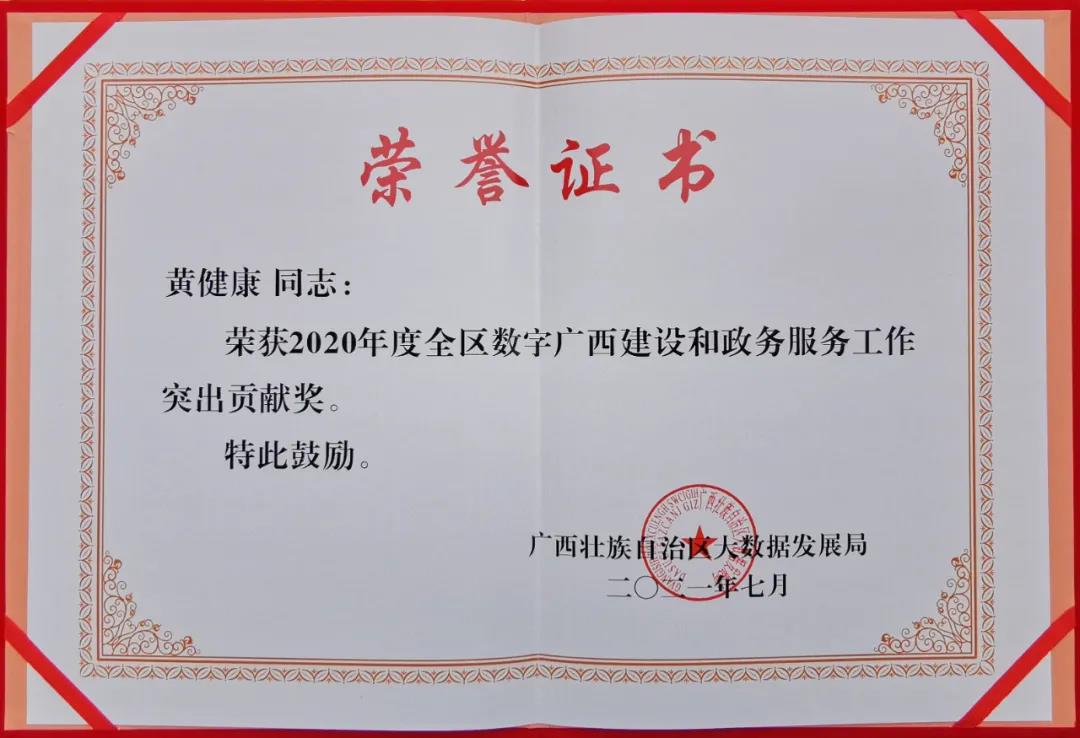 黄健康被评为2020 年度全区数字广西建设和政务服务工作突出贡献奖个人。