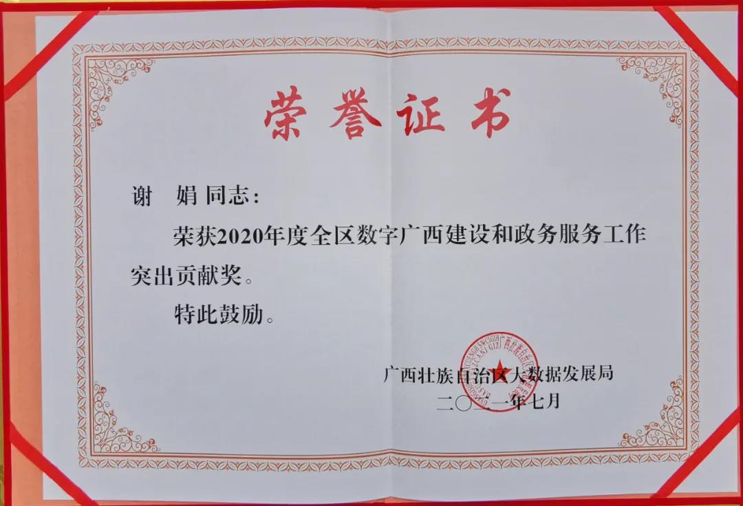 谢娟被评为2020 年度全区数字广西建设和政务服务工作突出贡献奖个人。