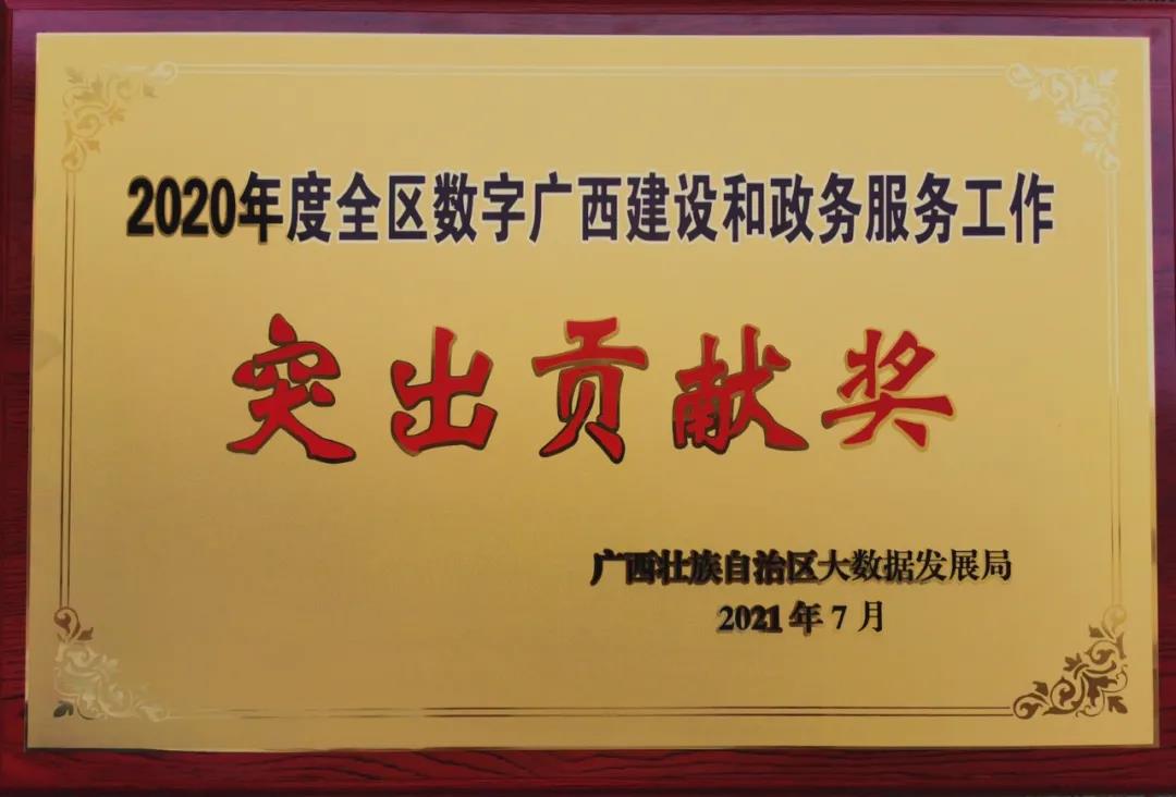 梧州数字科技产业集团有限公司被评为2020 年度全区数字广西建设和政务服务工作突出贡献奖集体。