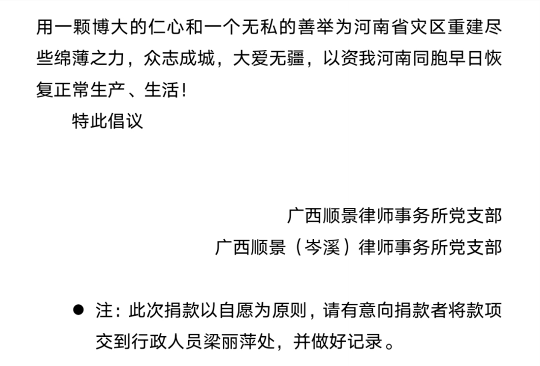 广西顺景律师事务所党支部开展 “爱心守望、助力河南”抗洪救灾捐款活动