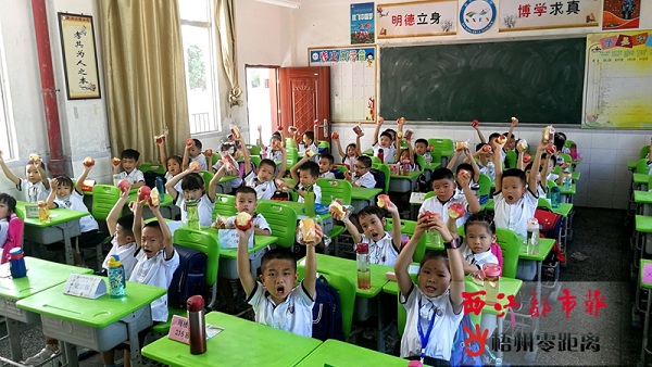 8月30日,梧州市新兴二路小学开展“开笔启蒙智人生 桃韵初心迎百年”秋季开学典礼暨新生开笔礼,老师为新生送糕点和苹果,祝愿同学们健康快长高,学业步步高。(图片由新兴二路小学提供)