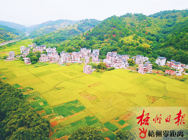 10月25日,龙圩区龙圩镇大恩村成熟的水稻一片金黄,与不远处经过乡村环境治理后的楼房相互映衬。梁金勇 龙海悦 摄