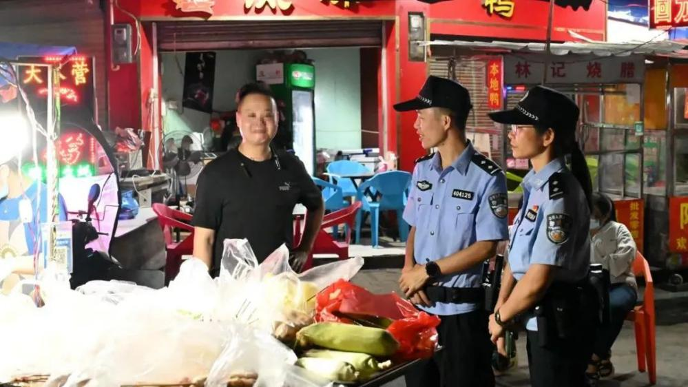 “老板,晚上经营要注意用火用电安全,注意防骗防盗,我们自己也要做到诚信经营,对客人负责,不能缺斤少两、强买强卖。”9月4日21时,在苍梧县石桥镇街道上,石桥派出所执勤民警耐心的向商铺业主说道。