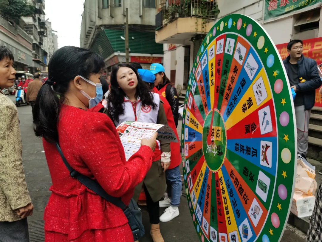 本次“志愿服务一条街”活动立足社区居民生活需求,设置垃圾分类宣讲、便民服务、政策宣传、卫生清洁、金融服务宣传等多个志愿服务项目,形式多样,内容丰富,得到市民积极热烈的参与。垃圾分类宣传通过现场设置“先学后考”“转盘问答”“抽卡投放”等趣味游戏,通过有奖问答的形式吸引居民群众参与进来,让社区居民既能涨知识还能赢礼品。面对回答错误的社区居民,志愿者们对其进行详细解答,帮助其掌握常见垃圾分类的判别方法。