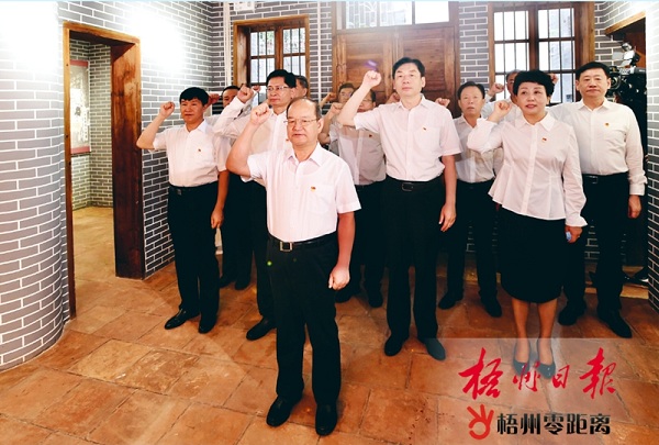 6月22日,在中共广西特委旧址,鹿心社带领自治区党委理论学习中心组成员重温入党誓词。 邓华 摄