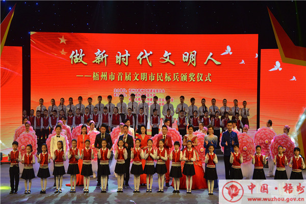 3月1日晚,“做新时代文明人”——梧州市首届文明市民标兵颁奖仪式在市文化展览中心剧场举行,来自各行业各领域的100名文明市民标兵受到表彰。市委书记全桂寿在颁奖仪式上致辞,并为文明市民标兵颁奖。