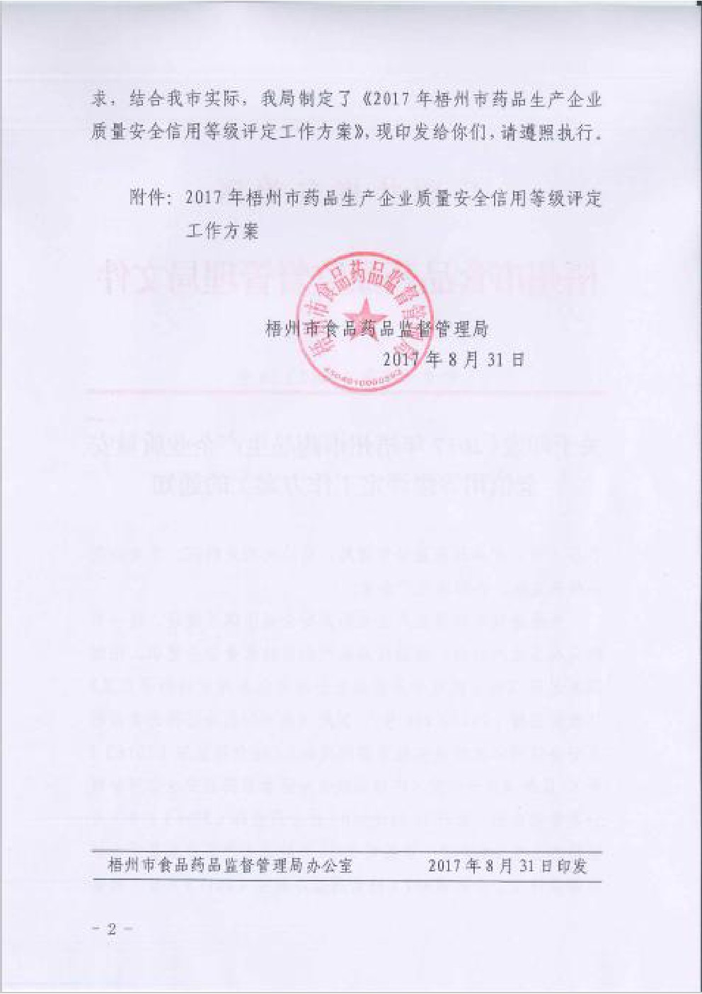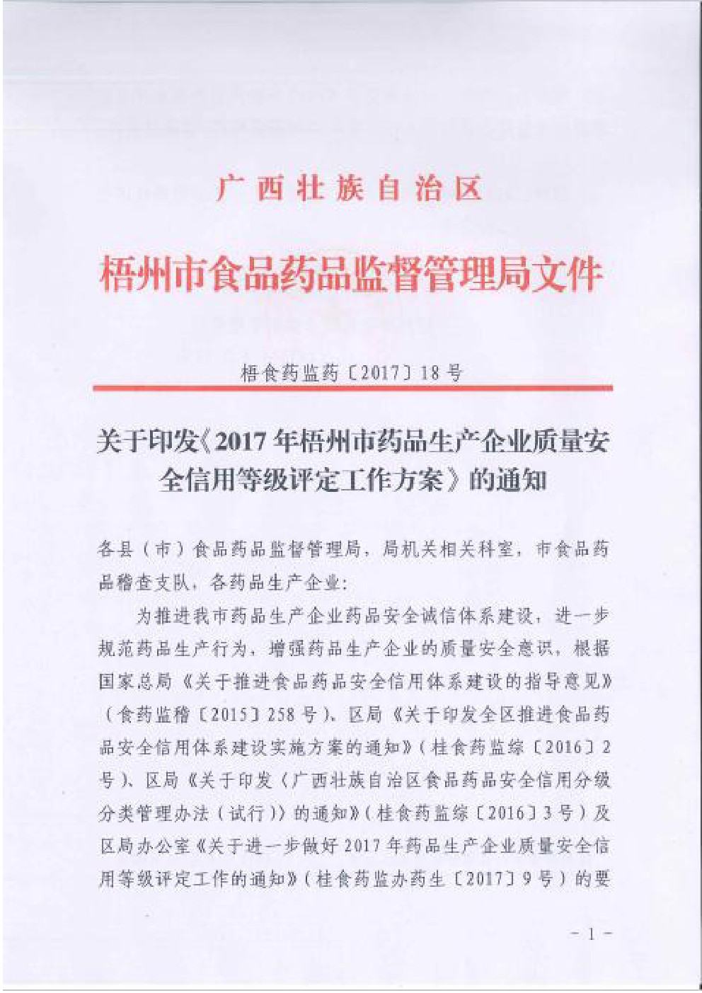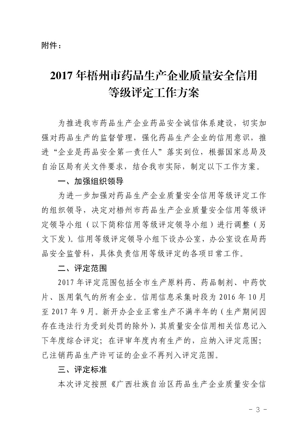 关于印发《2017年梧州市药品生产企业质量安全信用等级 评定工作方案》的通知