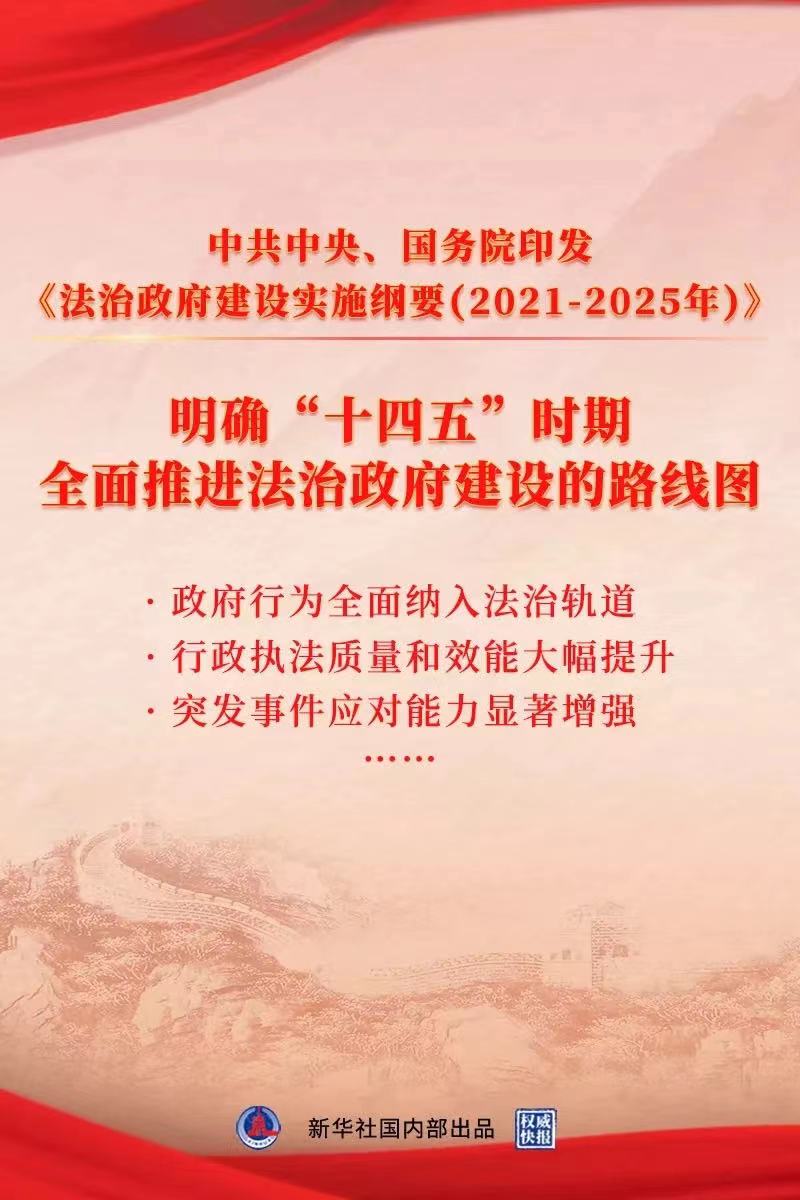近日,中共中央、国务院印发了《法治政府建设实施纲要(2021-2025年)》,并发出通知,要求各地区各部门结合实际认真贯彻落实。