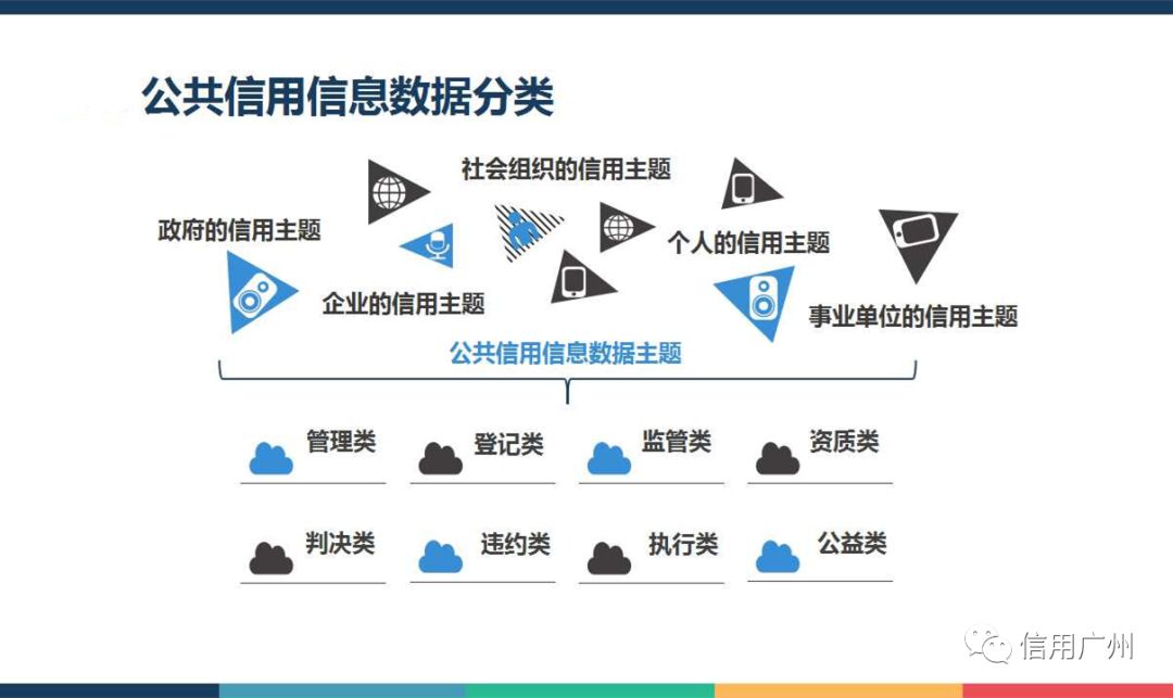 广州市公共信用信息管理系统由1个信用信息资源目录体系、3个信用服务系统、5类信用主体库和1个信用网站组成。系统已归集广州市52个社会信用体系建设成员单位547个数据主题,超过26亿条数据,建成个人、政府、企业、事业单位、社会组织等5类信用主体数据库,入库近10亿条数据,覆盖全市常住人口和企事业单位,向政府、公众、信用服务机构提供信用信息服务。市民和企业可通过全市统一的信用信息服务门户“信用广州”网和市信息化公共服务大厅信用信息服务窗口依授权查询信用信息,申请信用信息修复和异议处理。