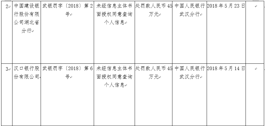 5月30日,农行、建行、汉口银行分别收到央行武汉分行的处罚决定,因违反《征信业管理条例》规定,都被重罚45万元。