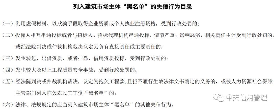 满足以下六项失信行为列入建筑市场主体“黑名单”:(一)利用虚假材料、以欺骗手段取得企业资质或个人执业注册资格,受到行政处罚的;(二)投标人相互串通投标或者与招标人、招标代理机构串通投标,情节严重,影响恶劣,相关责任主体受到行政处罚的,或经法院判决或仲裁机构裁决认定为负有直接责任或主要责任的;(三)发生转包、出借资质,或者挂靠、借用资质投标,受到行政处罚的;(四)发生较大及以上工程质量安全事故,受到行政处罚的;(五)经法院判决或仲裁机构裁决,认定为拖欠工程款,且拒不履行生效法律文书确定的义务的,或被人力资源社会保障主管部门列入拖欠农民工工资“黑名单”的;(六)法律、法规规定的应当列入建筑市场主体“黑名单”的其他失信行为。